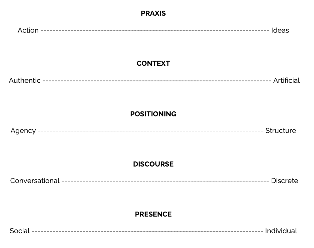 As mentioned, the limitations of this model became apparent through continued practice, with the conditions proposed not fully embracing the complexities of the classroom. Curious to see a model more reflective of and embracing the realities I was facing in the classroom; I sought to reframe and rearticulate these conditions through ongoing critical reflection upon its application. The findings of this current phrase of investigation position five ideals – praxis, context, positioning, discourse and presence. Rather than ‘spaces’ for pedagogy to consider (as shown in the initial model), this revised model presents independent yet interrelated continua in which practice can be situated. Some of the initial conditions remain; others have been more clearly defined – collectively, the conditions now have ends to their continua.